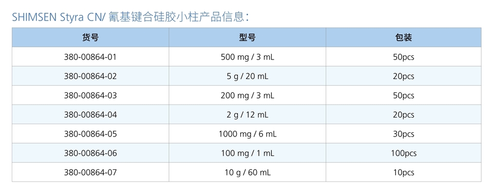 氰基键合硅胶小柱,既具有非极性的相互作用力,也同时具备极性相互作用力,适用于使用C18与C8或使用SI很难洗脱的化合物。