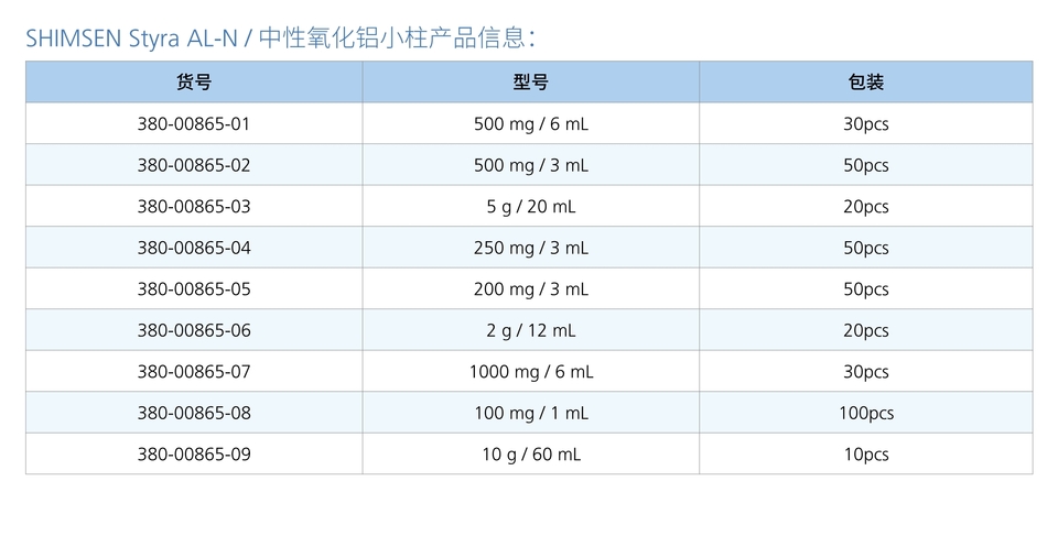 氧化铝(Al₂O₃)小柱,N型为中性氧化铝,用于保留或去除极性化合物。中性Al₂O₃和硅胶一样,都属于强极性吸附相,但是在高pH值条件下,中性Al₂O₃比硅胶更稳定。这种吸附相的表面是电中性的,容易保留芳香族和脂肪胺等富电化合物,同时,对含负电基团(如含氧、磷、硫的基团)的样品也能产生保留作用。