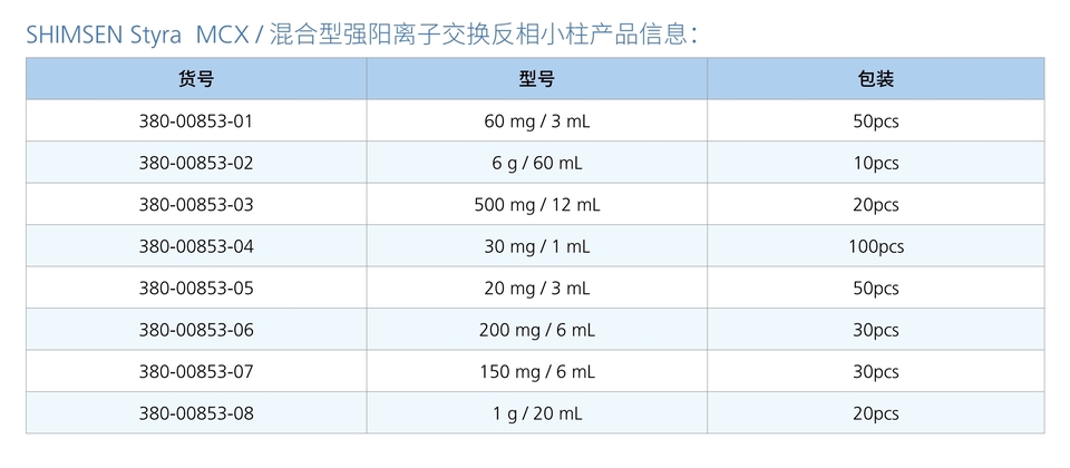 以苯乙烯-二乙烯基苯和亲水性基团共聚物为基体,导入强酸性官能团,同时具有反相和强阳离子交换作用。MCX适合pKa值处于2-10之间的碱性化合物的富集净化。