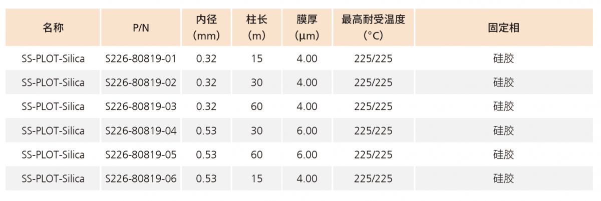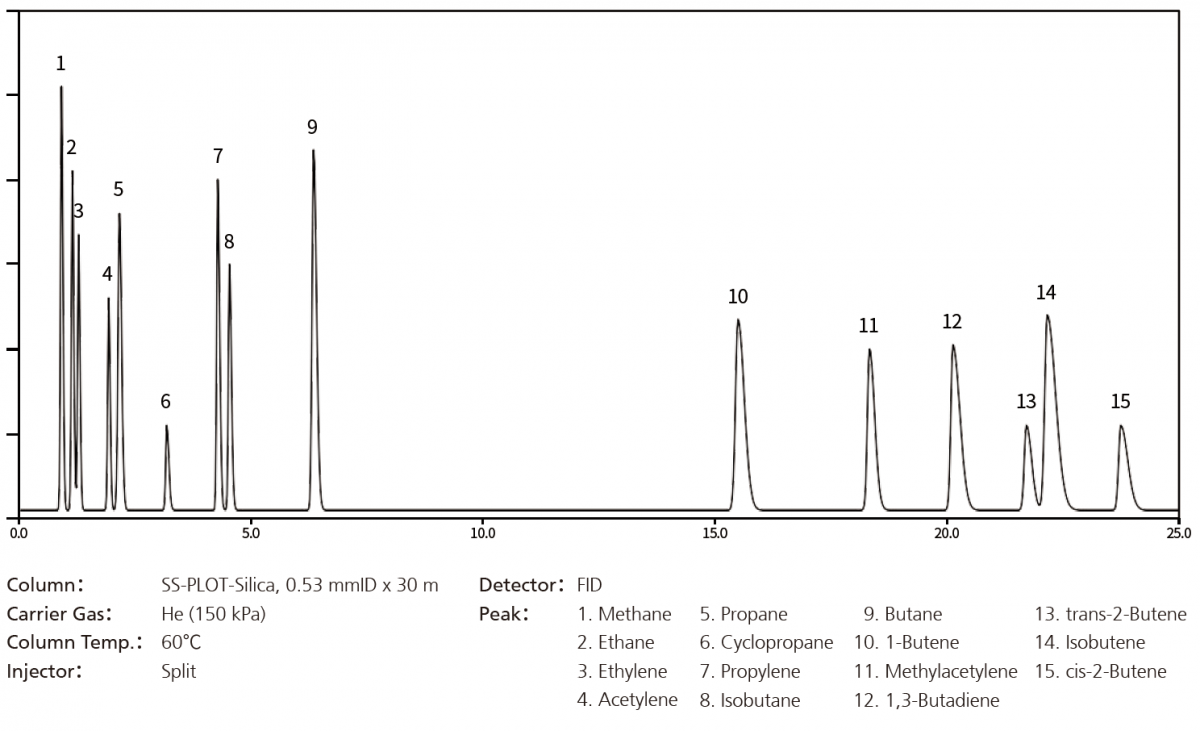 SS-PLOT-Silica 可用于分析C4 以下碳氢化合物的异构体。此外,由于水分几乎不会影响保留时间,因此即使样品气体中含有大 量水,也能够保证分析的稳定性。此外,H2S 和COS 等含硫气体也可以在ppm 级进行分离和定量。