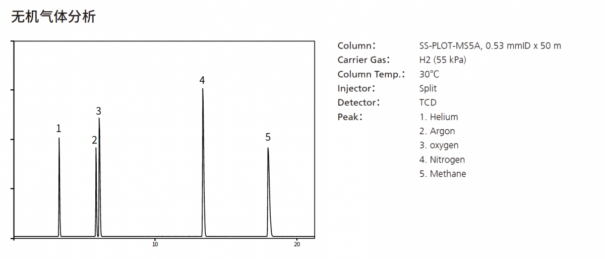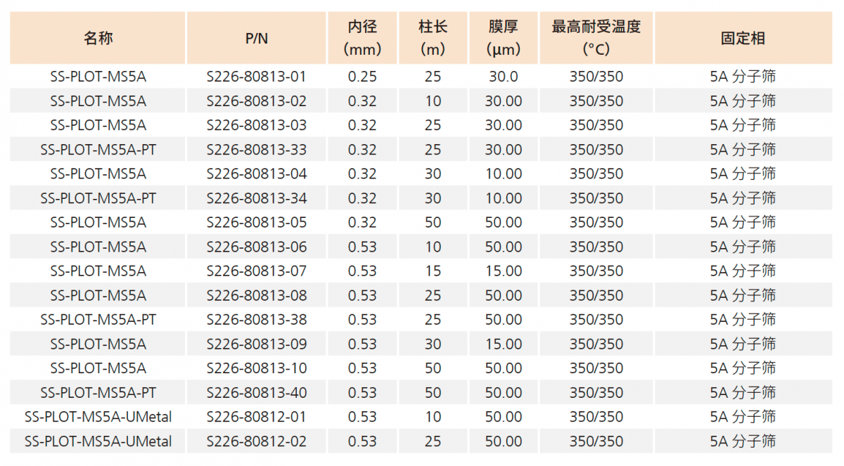 SS-PLOT-MS5A 是专用于无机气体分析的色谱柱。传统分子筛色谱柱由于存在吸附作用,容易导致一氧化碳(CO) 保留过强而发 生峰拖尾情况。在这种5A 分子筛色谱柱中,CO 能够快速洗脱且峰形对称。即使在室温条件下也能实现氩气和氧气良好分离。 由于其表面涂有5A 分子筛,几乎不会出现颗粒脱落现象。当与MS 检测器连接时,建议使用带颗粒捕集柱的5A 分子筛色谱 柱(SS-PLOT-MS5A-PT)。SS-PLOT-MS5A-UMetal 则为去活金属毛细管柱,可抵抗物理冲击,因此比熔融石英毛细管柱更容易操作。
