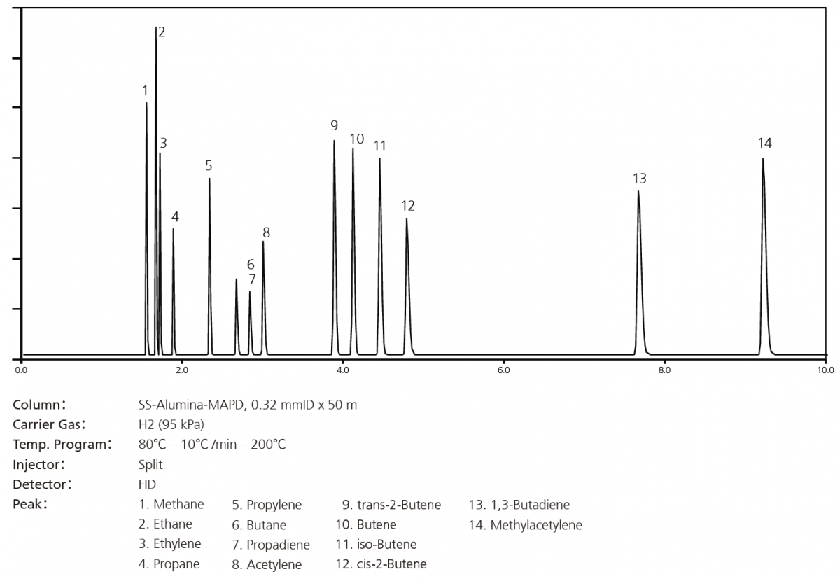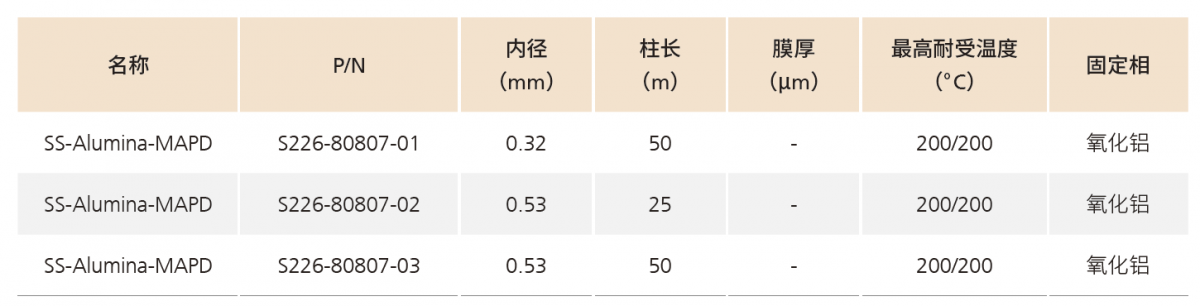 SS-Alumina-MAPD 是一种专用于分离丙炔和丙二烯(MAPD) 的氧化铝色谱柱。该色谱柱耐温高,最高可在200℃下使用,最高可分析C10 的碳氢化合物。此外,它还具有出色的稳定性,能最大程度地减少因受潮而引起的保留时间波动。它对C1-C5 碳氢化合物的选择性很高,可进行ppm 级别的准确分析。由于氧化铝吸附剂固定在色谱柱内壁上,因此无需担心固定相脱落。