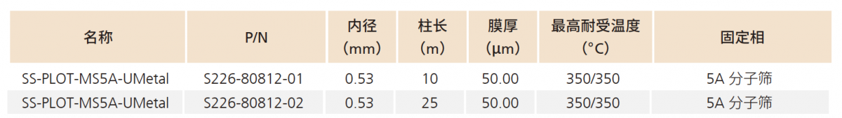 SS-PLOT-MS5A 是专用于无机气体分析的色谱柱。传统分子筛色谱柱由于存在吸附作用,容易导致一氧化碳(CO) 保留过强而发 生峰拖尾情况。在这种5A 分子筛色谱柱中,CO 能够快速洗脱且峰形对称。即使在室温条件下也能实现氩气和氧气良好分离。 由于其表面涂有5A 分子筛,几乎不会出现颗粒脱落现象。当与MS 检测器连接时,建议使用带颗粒捕集柱的5A 分子筛色谱 柱(SS-PLOT-MS5A-PT)。SS-PLOT-MS5A-UMetal 则为去活金属毛细管柱,可抵抗物理冲击,因此比熔融石英毛细管柱更容易操作。