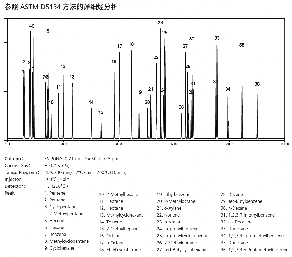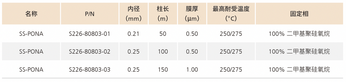 SS-PONA 是专用于 PONA 分析的色谱柱,符合 ASTM D5134-90 标准。保证理论板数可达 225,000 及以上,其性能符合 ASTM规范,即 2- 甲基庚烷和 4- 甲基庚烷之间的分离度可达 1.35 及以上。
