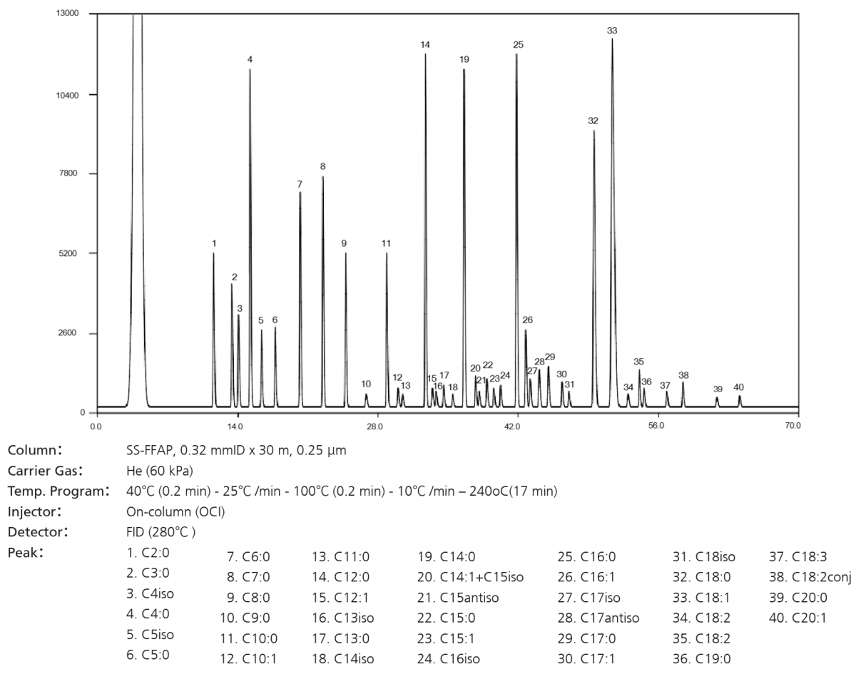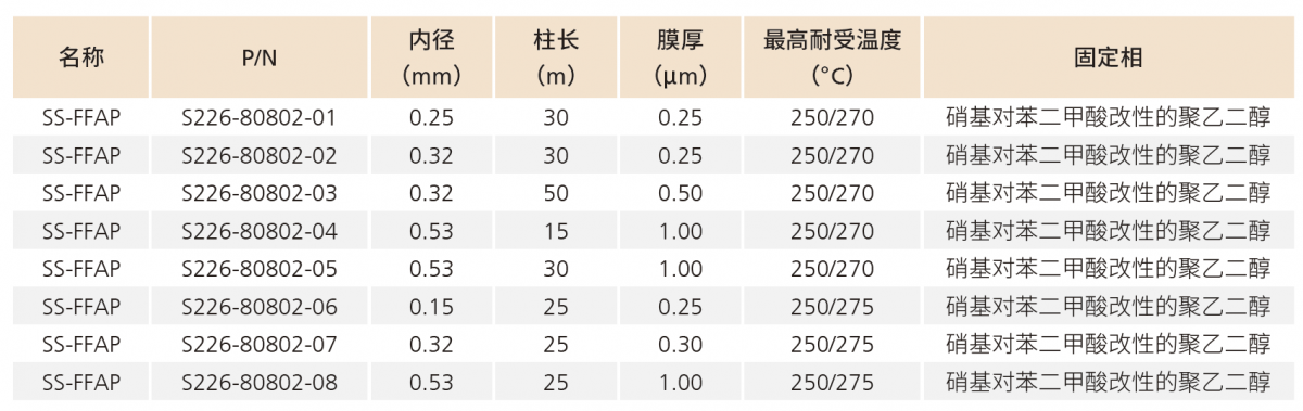 SS-FFAP 是一种专用于游离脂肪酸分析的色谱柱。通过固定液交联键合可将最高工作温度提高到250 ℃,可完成游离脂肪酸的 分析,且无需进行甲酯化衍生处理。与此同时,在注入大量水或有机溶剂时也几乎不会影响SS-FFAP 的性能。