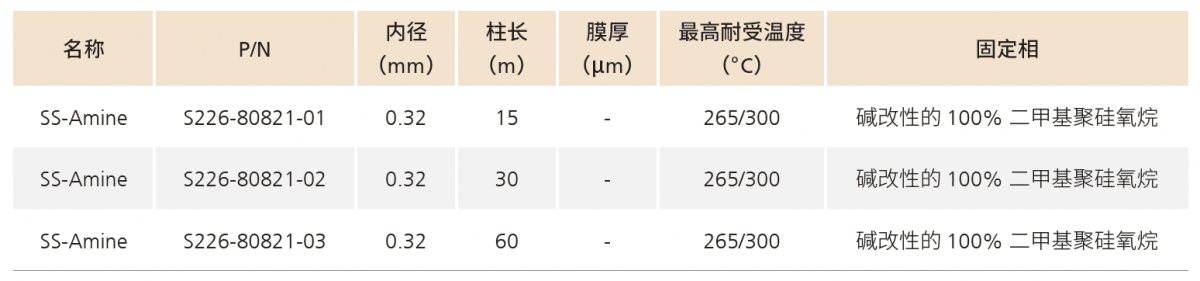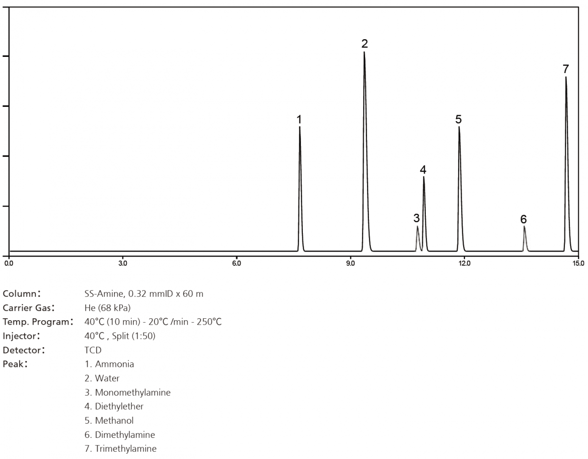 SS-Amine 是专用于挥发性胺分析的色谱柱。该色谱柱采用非极性固定相,具有很高的耐水性,可获得出色的对称峰形。即使 在分析含水量较多的样品时,也能稳定地分析挥发性胺。适用于分析一甲胺、二甲胺和三甲胺以及C10 以下的胺类分析。