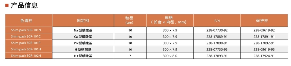 Shim-pack SCR-101N / C / P适用于单糖分析,分离模式是凝胶过滤和配位交换的混合模式,且由于其配位离子不同,分离选择性也有所差异。Shim-pack SCR-101H 和 SCR-102H 是离子排阻色谱柱,使用H型磺化交联聚苯乙烯聚合物作为载体,是使用酸性水溶液(例如高氯酸水溶液) 作为流动相是分析有机酸的理想选择。