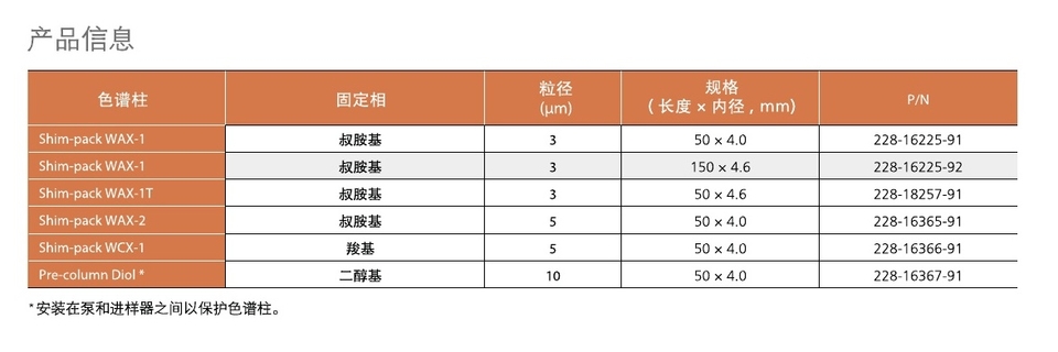 Shim-pack WAX / WCX系列色谱柱是亲水硅胶的离子交换柱。 Shim-pack WAX-1是分析核苷酸和寡核苷酸的理想选择,而Shim-pack WAX-2和WCX-1是分析蛋白质的理想选择。