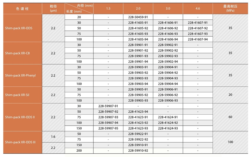 除了通用型的 C18 柱子之外 , Shim-pack XR 系列产品还包括 Shim-pack XR-C8,提供不同保留能力的同时,还提供键合苯基的Shim-pack XR-Phenyl 以及适用于正相快速分析的 Shim-pack XR-SIL 硅胶色谱柱。