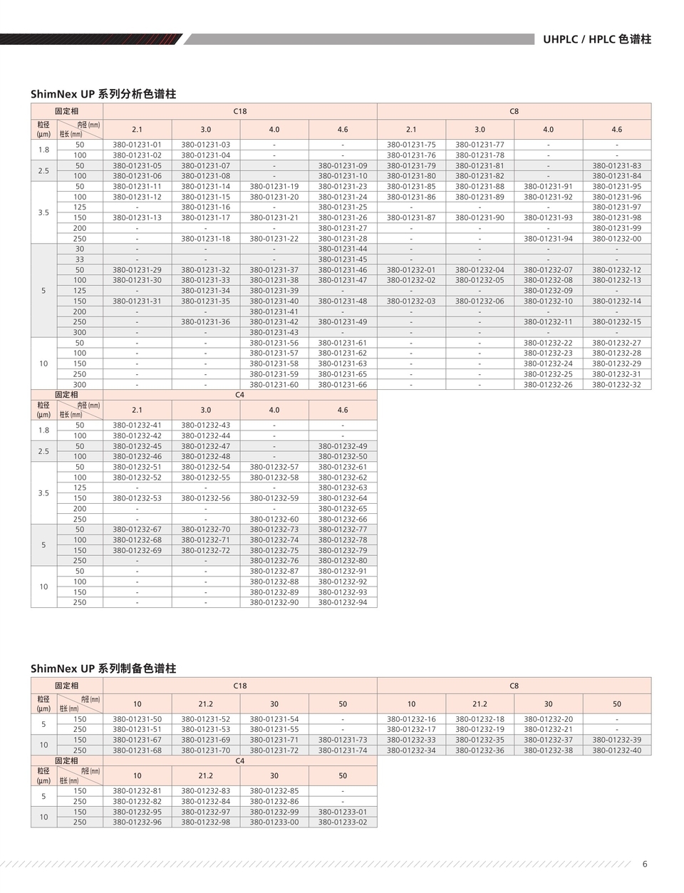| ShimNex UP 系列色谱柱,除了提供 5µm、3.5µm 等适用于HPLC 分析的规格外,同时也提供亚 2µm 等适用于 UHPLC 的色谱柱,和制备规格的10µm 粒径色谱柱。严谨的工艺过程、严格的质控体系,保证了不同规格色谱柱填料之间的一致性,从而实现从 UHPLC 到 HPLC,到制备的无缝转移。 | ![]() |