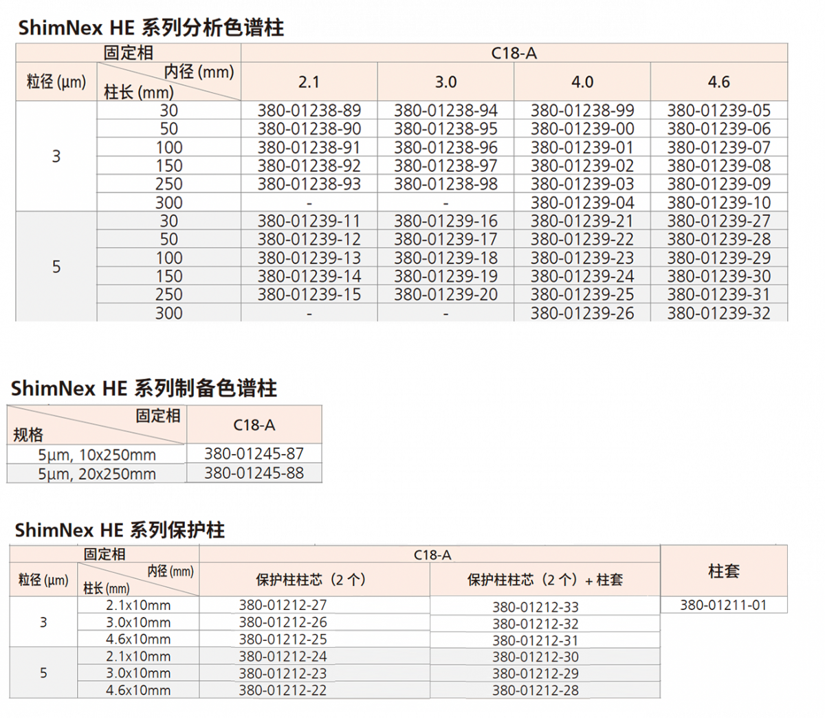 ShimNex HE 系列由于填料粒径均一、硅胶表面参数的优化设计,在保证分离度的前提下,化合物洗脱更迅速。具有高分析效率、高稳定性等特点。该系列囊括了多达 20 种不同的键合相,可满足不同样品对选择性的复杂要求。包括有异丁基侧链保护的 ShimNex HE C18-A、C8-A;兼具 C18 和苯环选择性优势的 C18-Ph;可用于反相、正相分离模式的 PFPP、CN 固定相等,提供了灵活的方法开发选择性,轻松应对各种分离难题。
