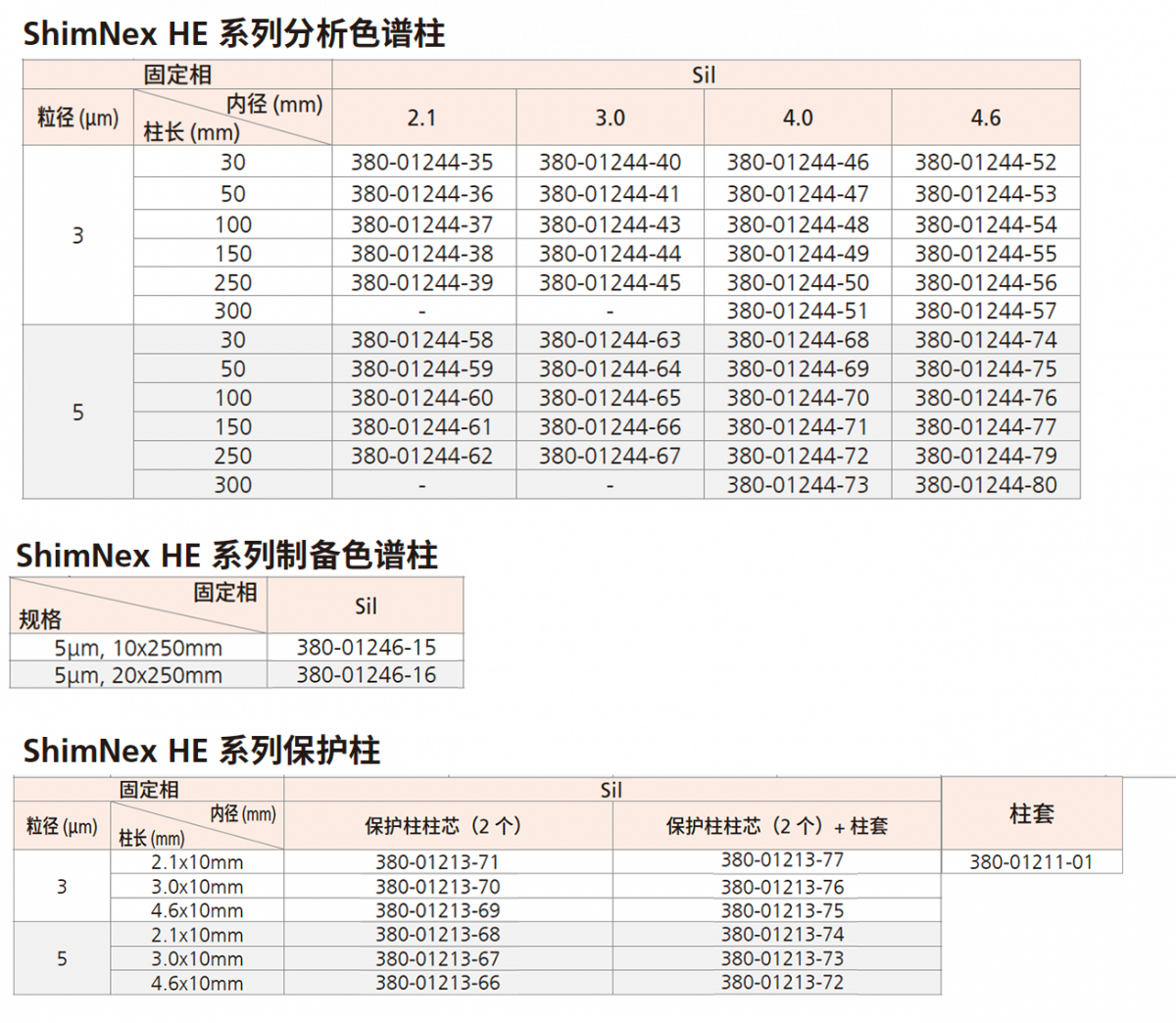 ShimNex HE 系列由于填料粒径均一、硅胶表面参数的优化设计,在保证分离度的前提下,化合物洗脱更迅速。具有高分析效率、高稳定性等特点。该系列囊括了多达 20 种不同的键合相,可满足不同样品对选择性的复杂要求。包括有异丁基侧链保护的 ShimNex HE C18-A、C8-A;兼具 C18 和苯环选择性优势的 C18-Ph;可用于反相、正相分离模式的 PFPP、CN 固定相等,提供了灵活的方法开发选择性,轻松应对各种分离难题。