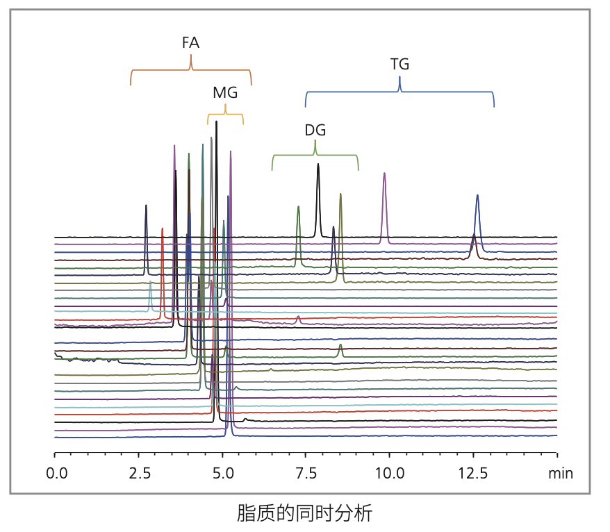 通常,对脂肪酸进行分析时使用气相色谱(GC),而对甘油脂进行分析时使用高效液相色谱(HPLC)等不同的分离方法。 然而,由于超临界二氧化碳具有与正己烷类似的性质, SFC非常适用于分析极性较低的化合物。 UC-HyP柱可以同时分析从脂肪酸到甘油脂的各种化合物。