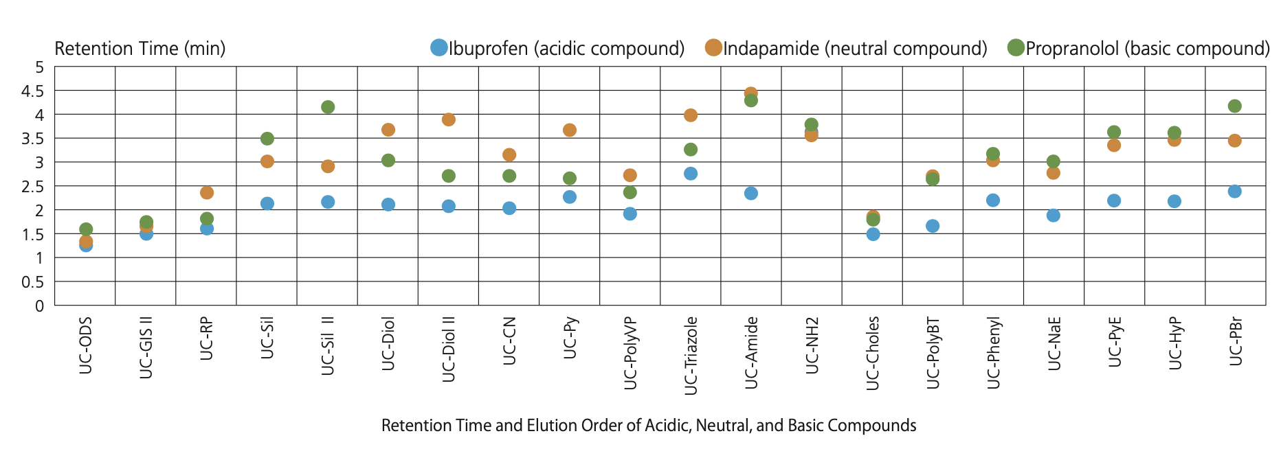 所有20种柱型都可以用于中性极性的化合物分离。下图展示了在分析典型的酸性、中性或碱性化合物时,保留行为如何根据所选择的固定相类