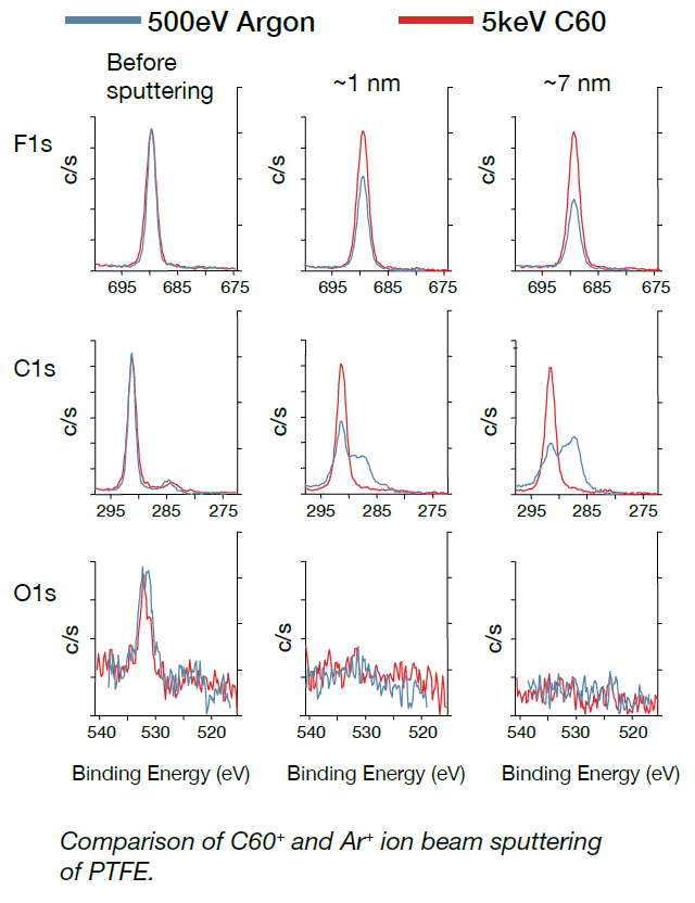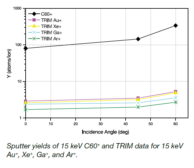 C60-20S在高达20 kV的电压下工作,可有效地溅射材料,且损伤较小,无需重新沉积碳。