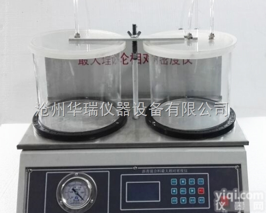 产品简介: 一、适用范围 产品适用于真空法测定沥青混合料理论相对密度,供沥青混合料配合比设计、路况调查或路面施工质量管理计算空隙率、压实度等使用。二、主要技术参数 1、振荡间隙:3min 2、真空度:-0.1MPa 3、容器容积:5000ml×2 4、振荡方式:连续/间隙 5、功率:300W 6、电源电压:220V±10%、50Hz; 7、外形尺寸:500×520×380(mm)。三、操作说明 依据试验规程的规定,仪器设有自动试验和手动试验两种程序功能。该仪器可同时检测2个平行试样,以进行对比。 1、连接电源(AC220V/50HZ) ,按下电源开关,电源指示灯亮,等待试验。 2、将负压容器(以下称料筒)连同其中的水(水温为 25℃±0.5℃)及混合料一起放入震动平台上 ...