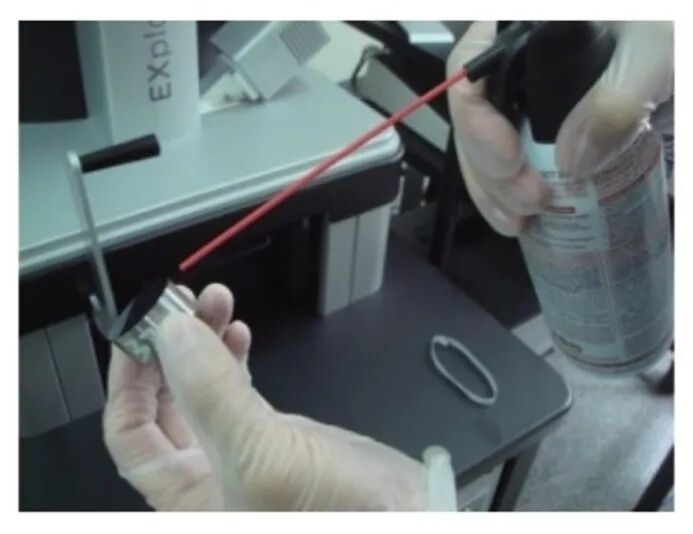 2)压缩空气吹拭:试样干燥后,用压缩空气吹拭,主要是将检测面四周黏附的丝绒等污物吹掉,也避免在下一步异丙醇擦拭时将边部的污物带到检测面上,如下图所示。前期一直采用洗耳球吹拭,由于洗耳球力度不够大,吹拭后还会有一些细小的污物附着在检测面上,如丝绒纤维等干燥后会黏附在试样上,且附着力较强。