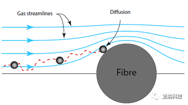 气溶胶颗粒在气体介质中会不断地做布朗运动,纤维材料有极大的概率收集偏离气流中心的小颗粒。这一方式可以收集绝大多数的超细颗粒物质,且分散性较好。