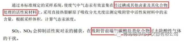 新标准解读二:标准阐述了该方法的基本原理,并着重指明用于气态汞吸附的活性炭应经过碘或者其他卤素及化合物进行处理。指出了SO2和NOX对活性炭吸附效率存在YZ作用,同时指明了相应处理措施,即吸附管前端添加除酸性气体单元;