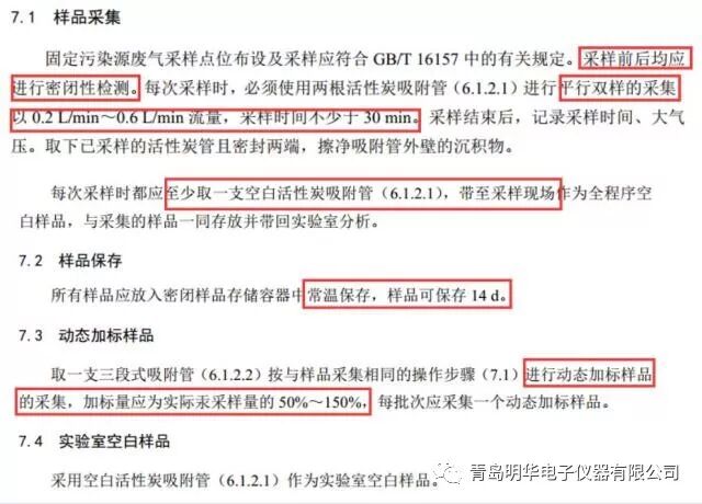 新标准解读六:规定了样品采样前采样系统要进行密闭性检测,推荐了合理的采样流量和采样时间范围以及现场和实验室空白样品处理及保存条件。为保证检测精度,标准同时还对加标样品进行了相关说明;