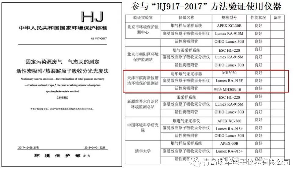 青岛明华电子公司参与了“HJ917-2017”标准的验证工作。在参与标准的验证过程中,积累了大量的经验和数据。经过大量的实验验证,明华设备MH3030B型烟气汞采样器和RA915S型高频塞曼效应汞分析仪具有良好性能。针对新标准,明华电子具体解决方案如下: