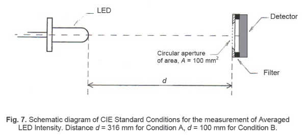 光强也是表征光源性能的物理量。光源在指定方向上单位立体角内发射的光通量定义为光源在此方向上的光强。光强的基本单位是坎德拉(candela), 相当于 1 流明 / 球面度(lm/sr)。对于光强度的测量,CIE127-2007 做了相关测试规定,分为 A、B 两种测试条件,在实际 LED 测试中,通常采用 B 条件