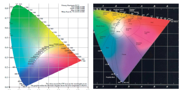 国际照明委员会(CIE)在 1931 年推荐的标准色度观察者光谱三刺激值函数及相应的色品图,至今在许多色度计量方面得到广泛的应用,使人们可以在统一的基准下进行颜色的计量测试和比较分析。但是在 CIE1931 标准色度系统的实际应用中发现了一些不足之处,尤其是色品图的不均匀性即在各色区中颜色感知差异的容限大小不等,于是 CIE 在 1976 年定义并推荐了改良的色品计算公式,得到色品均匀性比较好的色品图,称为 CIE1976 体系。