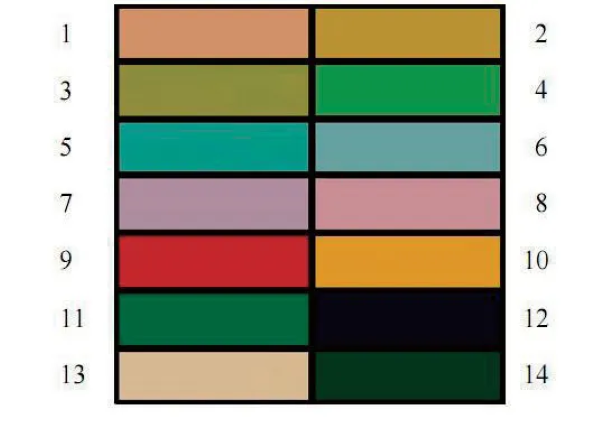 CIE 光源显色性评价方法把在待测光源下物体色和在参照照明体下物体色的一致性进行量化,称为显色指数。即对象在某光源照射下显示之颜色与其在参照光源照射下之颜色两者之相对差异。CIE 采用了一套共 14 种试验色,其中 1 ~ 8 号共 8 种试验色用于光源一般显色指数(Ra)和特殊显色指数的计算,这 8 种试验色代表了各种不同的常见颜色,而 9 ~ 14 是一些饱和色和皮肤色,专用于特殊显色指数的计算。