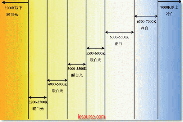 色温及相关色温:当光源所发出的光的颜色与黑体在某一温度下辐射的颜色相同时,黑体对应的温度就称为该光源的色温,用绝对温度 K 表示。对于一般光源,它的颜色与任何温度下的黑体辐射的颜色都不相同,这时用相关色温来表示。在均匀色品图中,如果光源的色坐标点与某一个温度下的黑体辐射的色坐标点最接近,则该黑体的温度称为该光源的相关色温。