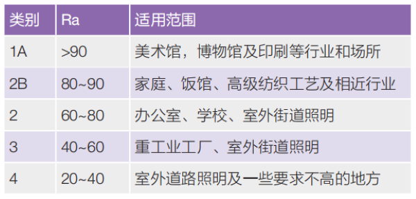CRI 在 LED 行业中通常是 R1~R14 的平均值针对适用场地的不同,国际照明委员会 CIE,一般把显色指数分为五类。