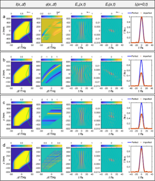 另外,研究团队在国际上率先揭示了压缩器光栅面型会引发强超短激光时空耦合畸变,并导致聚焦光强下降的物理机理(Appl. Phys. Express 10, 102702 (2017)和Opt. Express 26, 8453 (2018))。这一发现在国内外引发了广泛的后续研究。