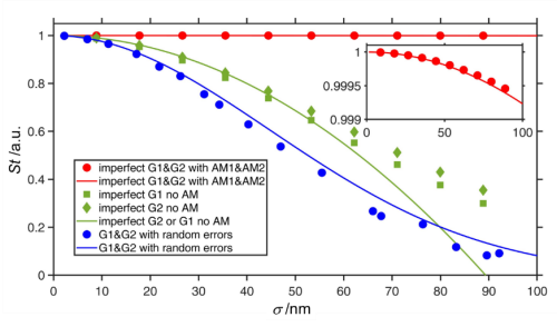 本研究表明,当光栅表面均方根粗糙度低于10纳米时,对聚焦光强的影响可忽略不计,这为强超短激光系统的米量级光栅制造提供了重要依据。相比于四光栅压缩器,双光栅压缩器在配合变形镜后,可有效补偿光栅大尺度表面误差引起的时空耦合畸变,同时压缩器具备结构简单、成本低廉、调试方便等优势。本研究为艾瓦级激光装置,特别是压缩器设计与光栅制备提供了理论指导和工程参考。