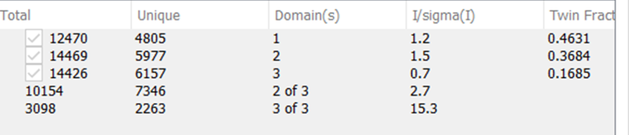虽然这个数据能够解析结构,但数据处理着实不怎么理想,重叠的比例较高,分辨率也不怎么理想。之前测过的7个晶体是不是就没用了呢?自然不是。挑出里面好的一个数据(主要是分辨率,可不是什么Rint…),按照正确的晶系进行处理,结果用孪晶的方式精修,得到的结果自然也提升了很多。而孪晶的比例也是符合推测,接近于1:1:1。