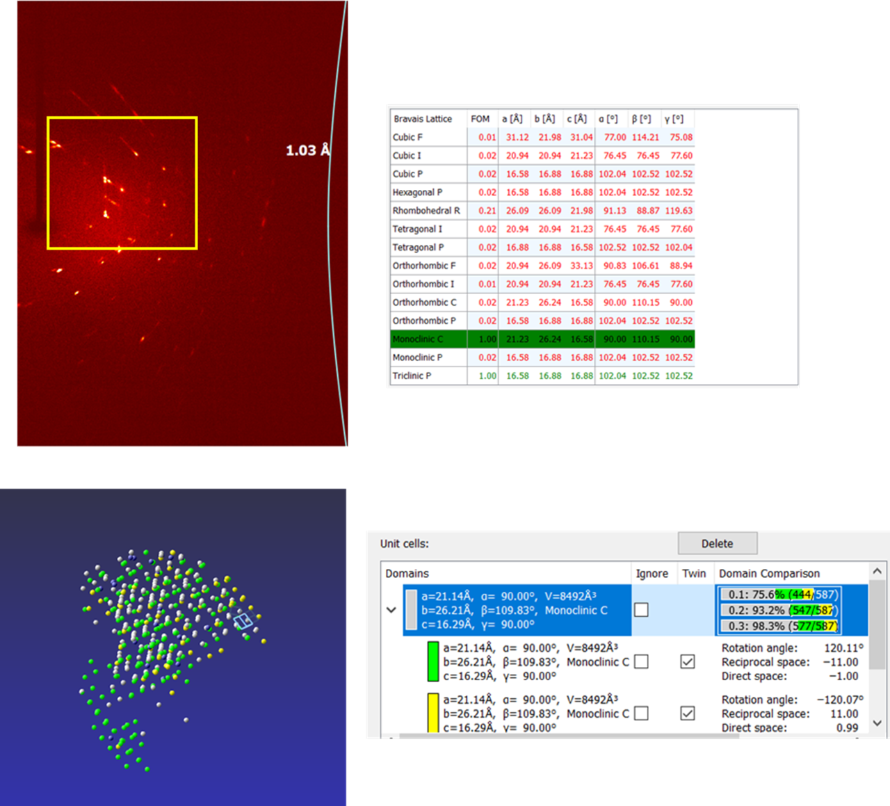 清晰的孪晶衍射点,然后Determine Unit Cell 告诉我们这是单斜C的孪晶。