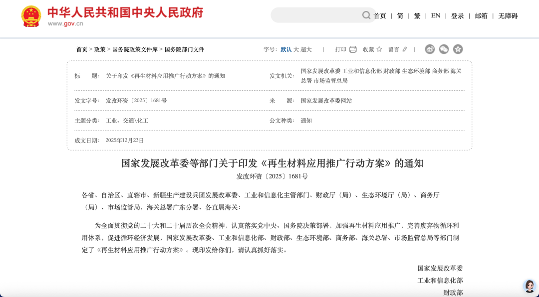 不久前,国家发改委、工信部、财政部、生态环境部等 7 个部门,联合印发了《再生材料应用推广行动方案》。这是我国首次,专门针对“再生材料怎么用、用到哪、怎么管”给出一整套系统部署的政策文件。