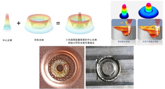 与普通光纤激光器相比,环形光斑激光器是将单一的高斯分布激光束,改为较复杂的由环状+中心光束组合而成的环形光束,且两个光斑都可以实现激光功率和出光时间的实时独立调整,为激光焊接带来了更大的灵活性和可能性。