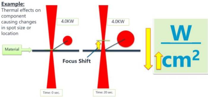 2. 功率检测发现激光器功率与初始没有改变,但是工作效果依然变差,这个其实是激光聚焦的焦点位置发生了改变(也就是我们常说的焦点飘移),最终导致工作点位置功率密度下降,从而达不到实际工作效果。