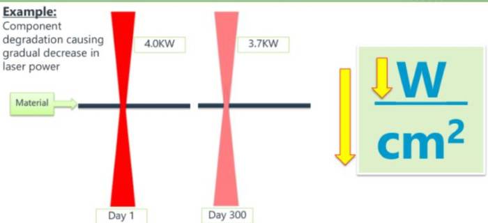 1. 随着使用时间的增加,实际切割或者焊接的时候会发现质量变差,最直接的体现就是在同样激光参数设置下,样品不能被切割开或者焊接变差出现虚焊等现象,这个是由于激光功率变化造成的,功率下降后最终在样品工作点位置功率密度下降造成的,此时需要调节激光参数从而达到最初设置;