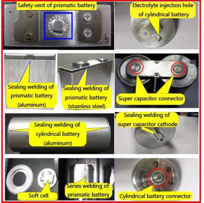动力电芯常见几种激光焊接位置,即盖板安全口、电芯&极柱、电池壳、密封销(电解液注入孔)、电池极耳、电芯极耳和顶盖。此外,超级电容器的焊接位置主要是连接器和阴极(封焊)。超级电容器和不同类型动力电池的激光焊接位置如图所示: